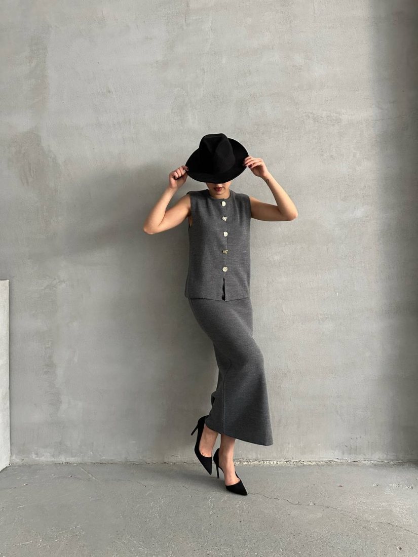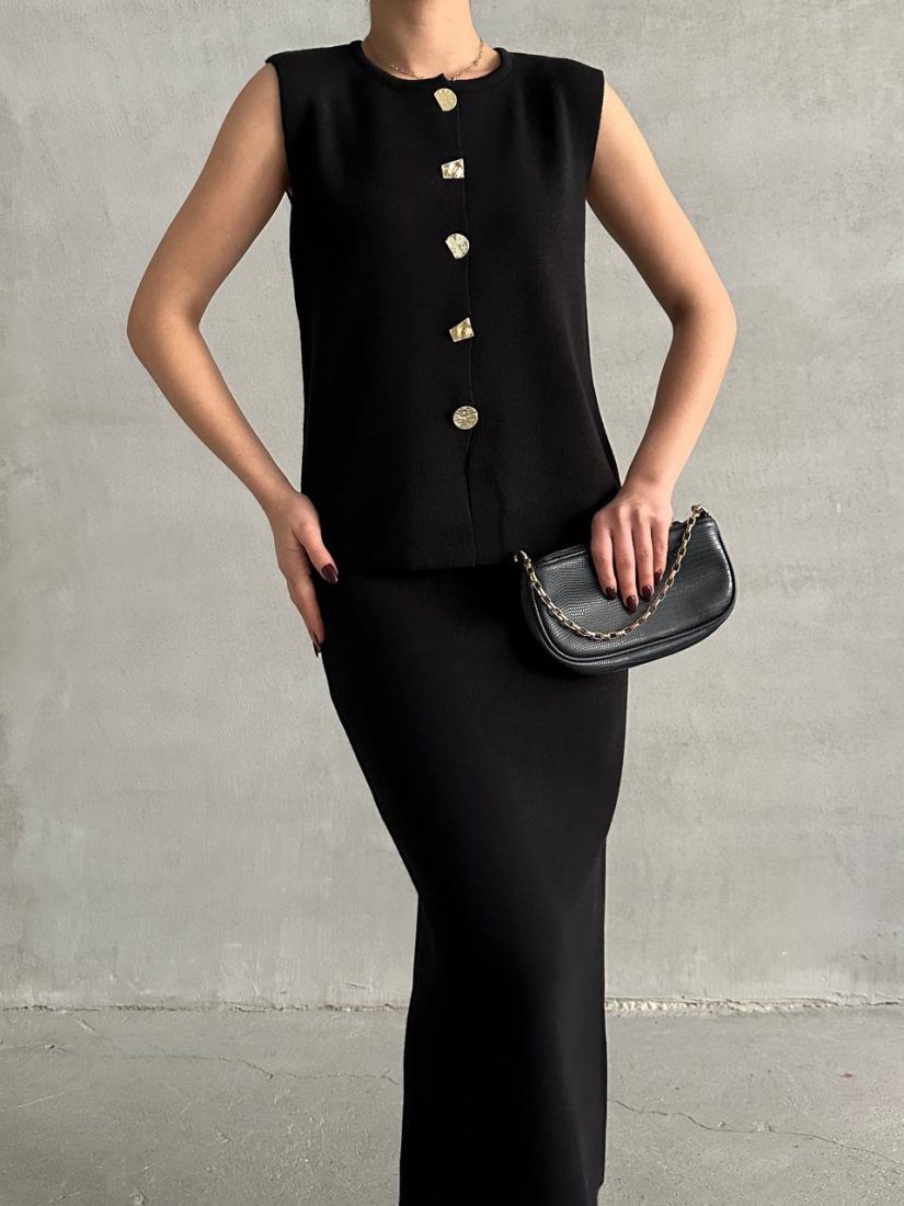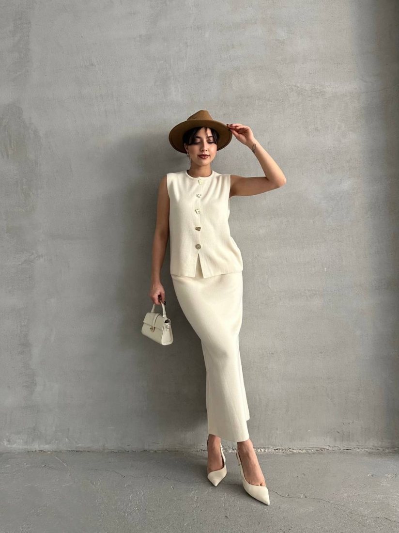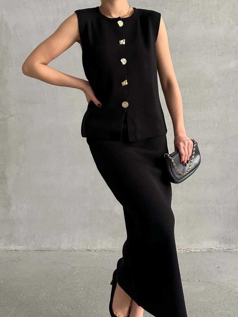 Αναβαθμίστε το στυλ σας με αυτό το κομψό σετ γιλέκο και φούστα με ελαφριά πλέξη. Σχεδιασμένο σε one-size, προσφέρει άνεση και κομψότητα για κάθε περίσταση.